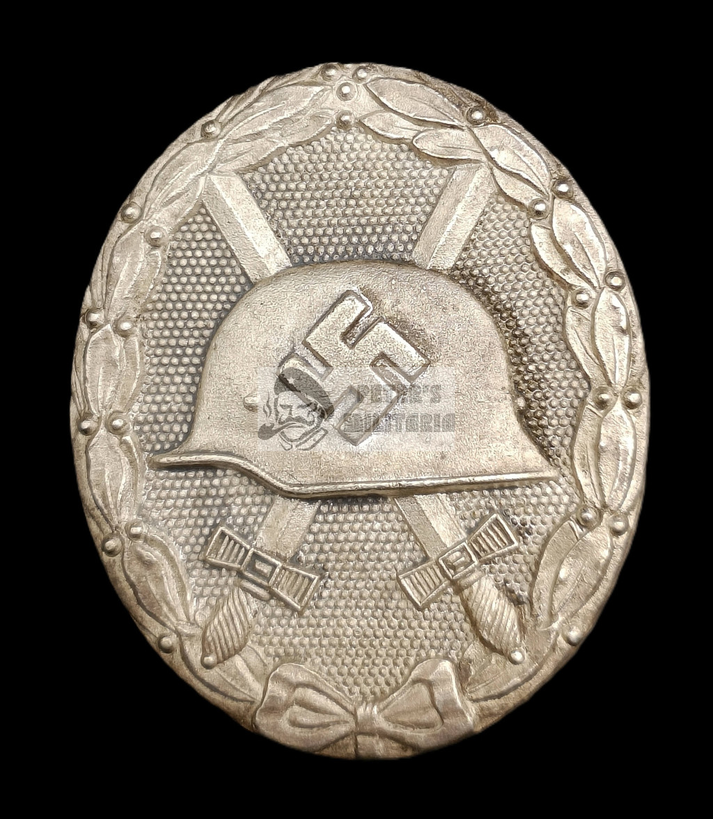 Cinkből készült, Ezüst fokozatú Sebesülési jelvény.