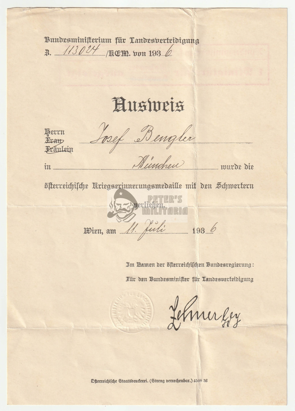 1936.07.11. - Osztrák Háborús Emlékérem kardokkal + 1 db miniatűr