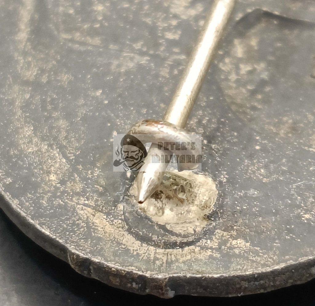 "Semi hollow" (egyfajta átmenet a teli és a lemez verzió között) kivitelű jelvény ezüst színmaradványokkal.