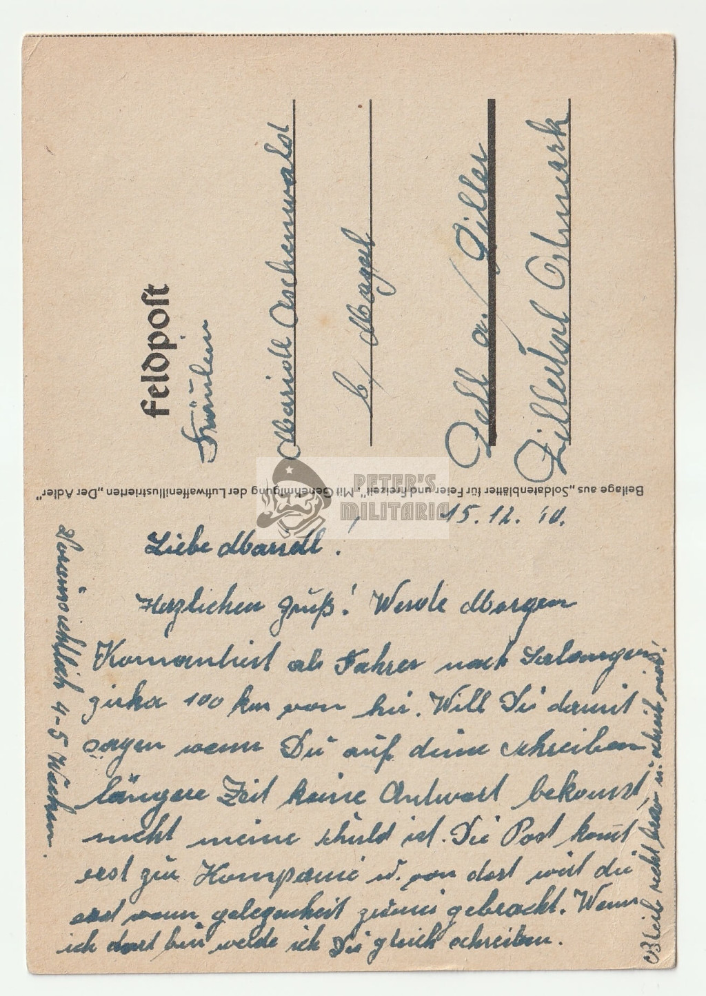 Reverse side bears a December 1940 address and written correspondence.