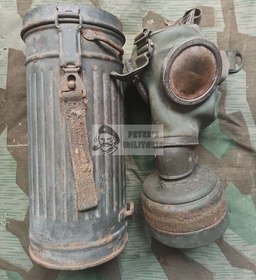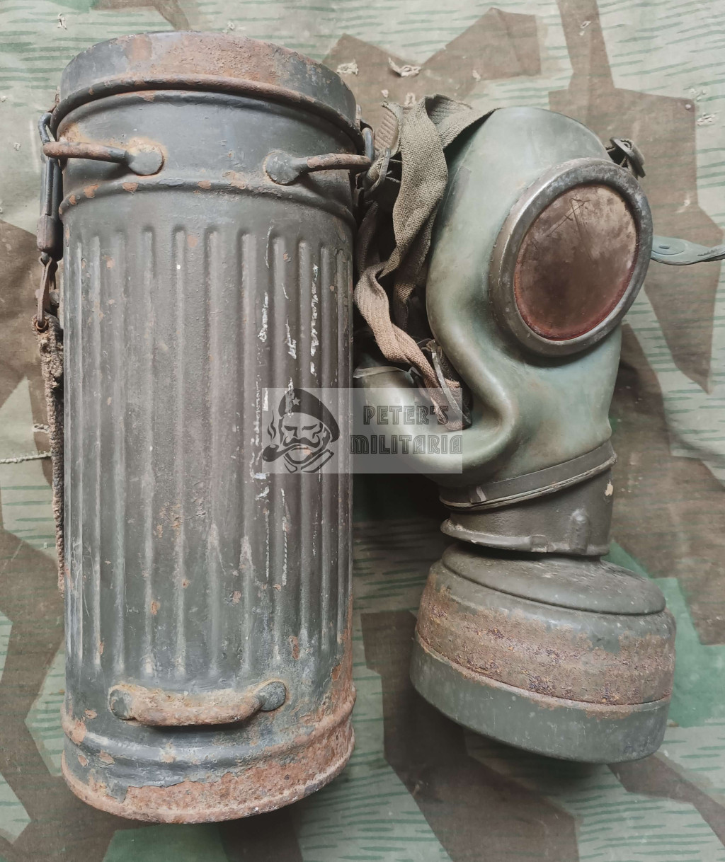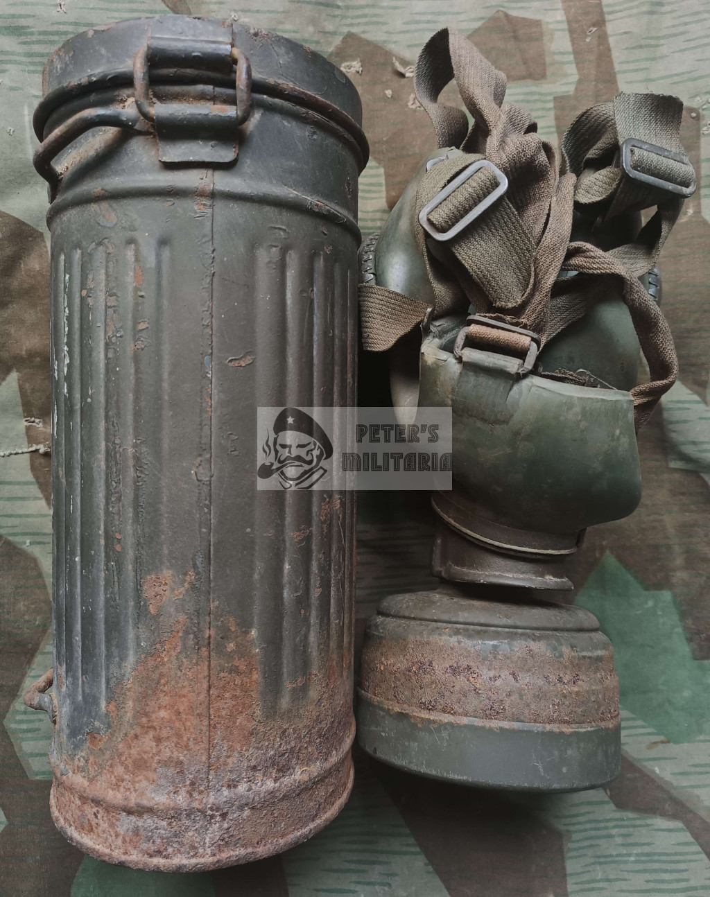Includes an M38 rubber mask inside the canister. Marked internally with “bwz” (Auer-Gesellschaft AG, Werk Oranienburg).