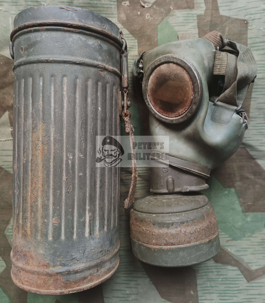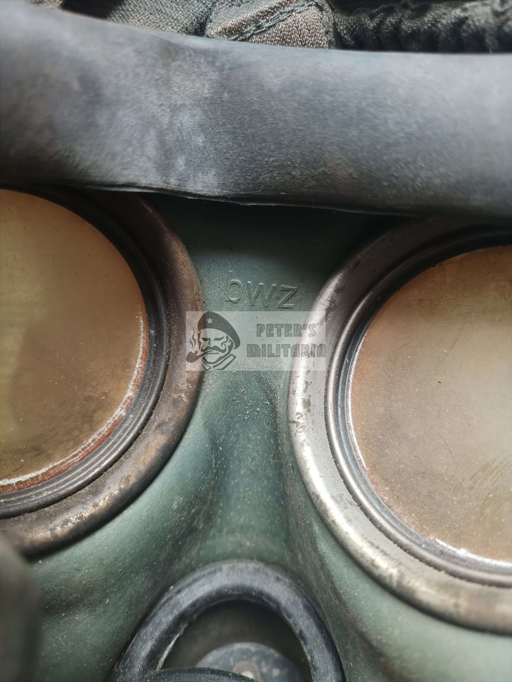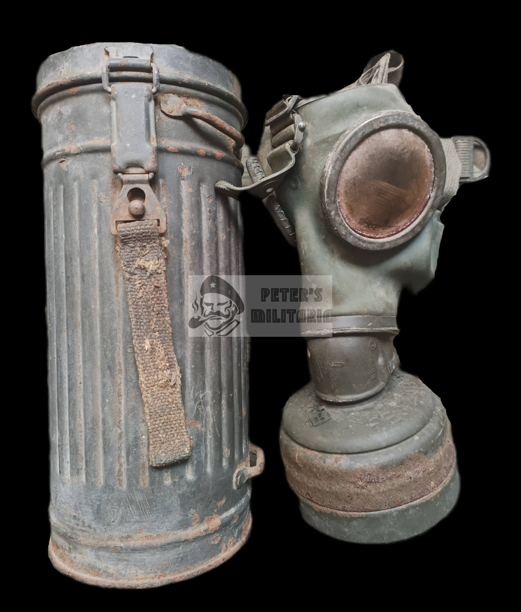 Includes an M38 rubber mask inside the canister. Marked internally with “bwz” (Auer-Gesellschaft AG, Werk Oranienburg).