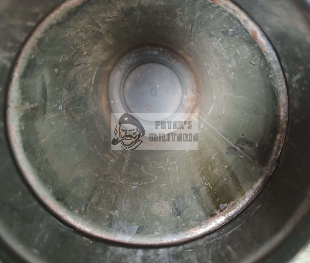 Canisters paint approximately 80% intact. Lock functions properly; lid opens and closes smoothly. Strap for opening is intact. Interior in good condition, no holes. Inside the top is marked with the production year 1944.