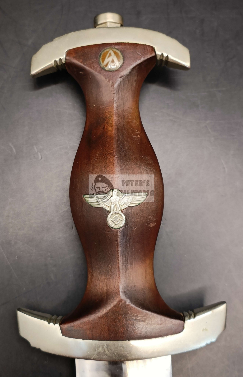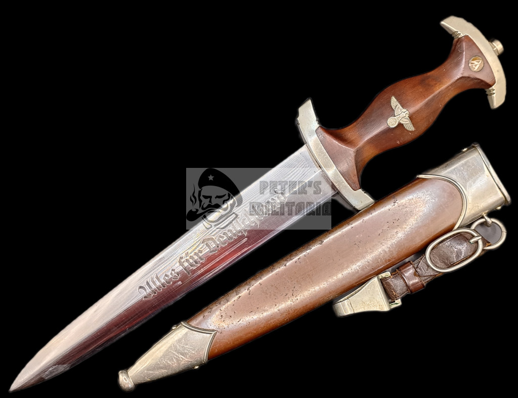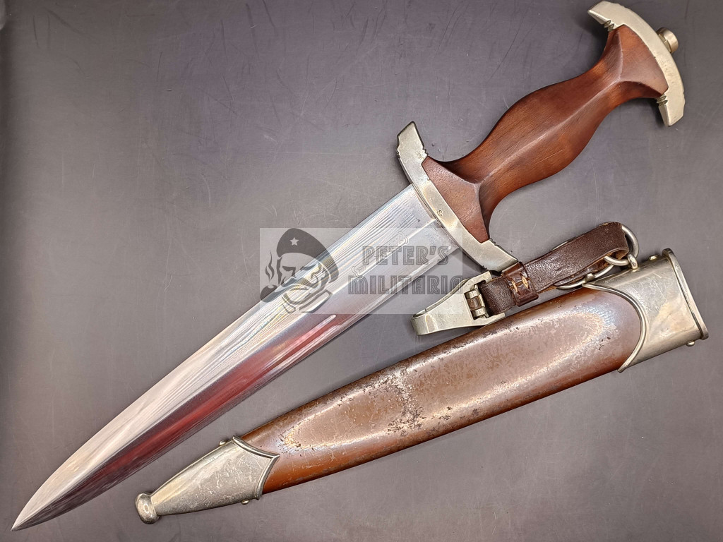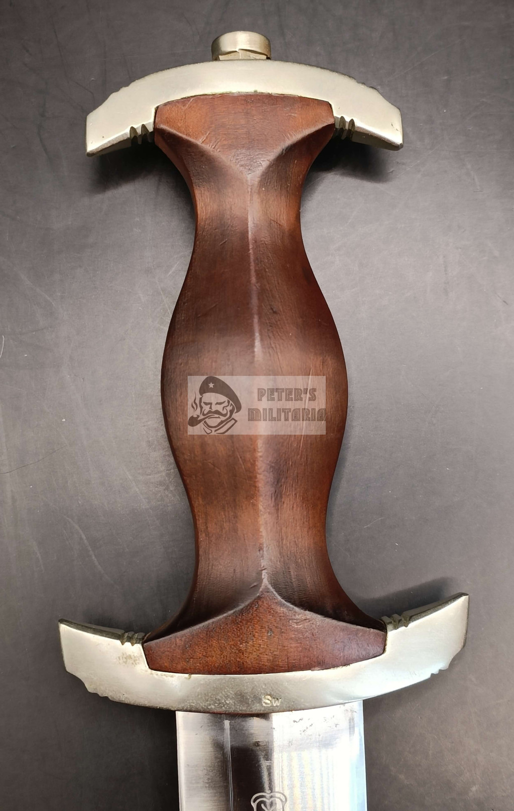 As characteristic of early pieces, the lower crossguard bears the “SW” SA Gruppe marking (Südwest).