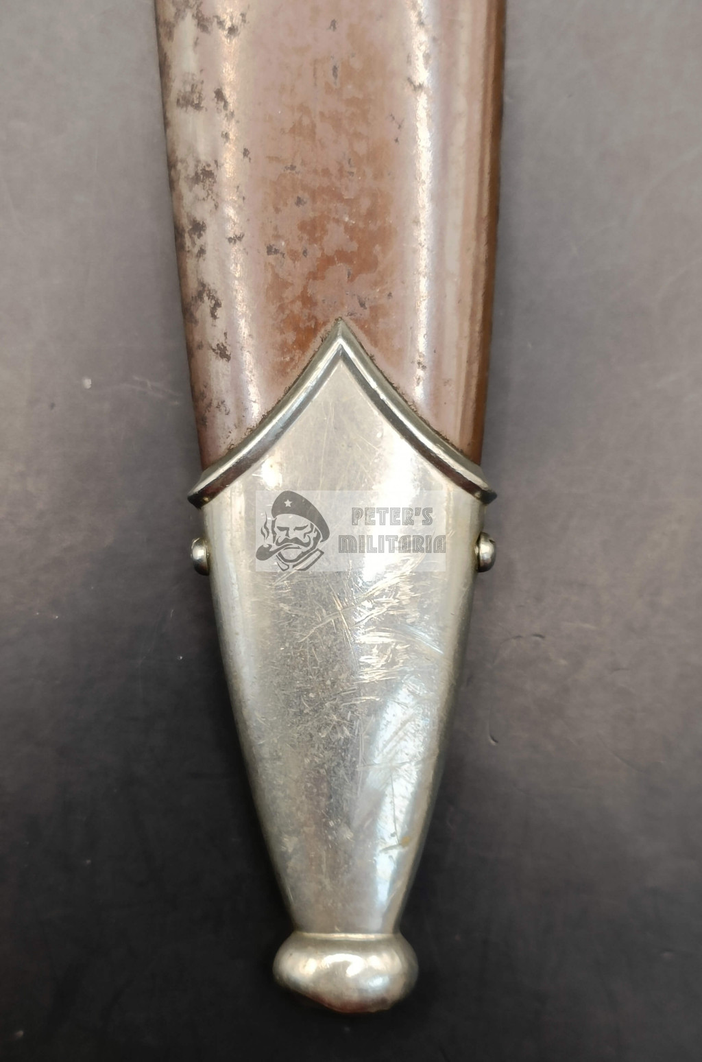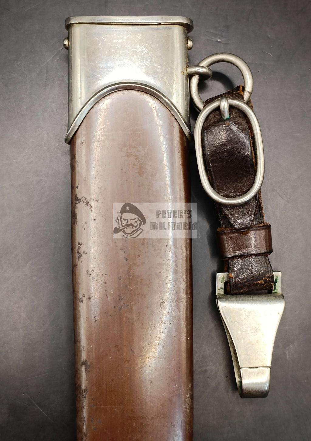 The scabbard is of the early anodized type rather than the later painted style.