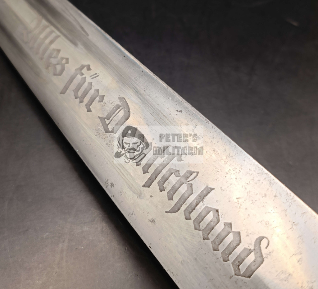 Blade with acid-etched ‘Alles für Deutschland’ motto, featuring the maker’s characteristic dotted background pattern.