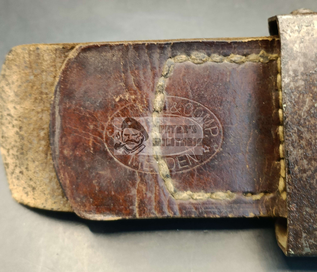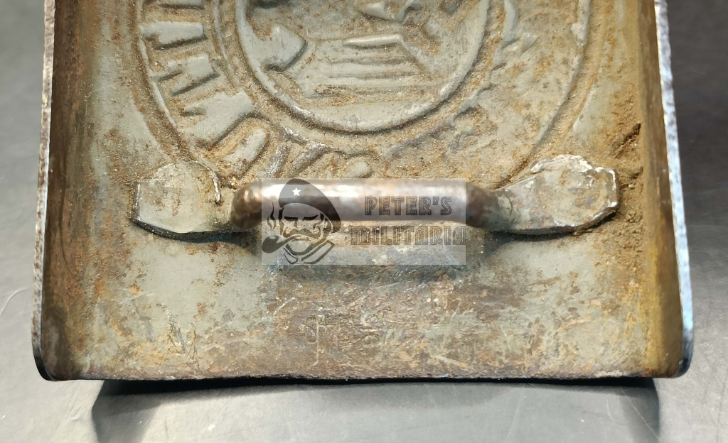 Steel buckle in worn condition with remaining traces of paint. At the base of the catch, the manufacturer’s logo (Schmöle & Comp.) and the year 1940 are visible under magnification.
