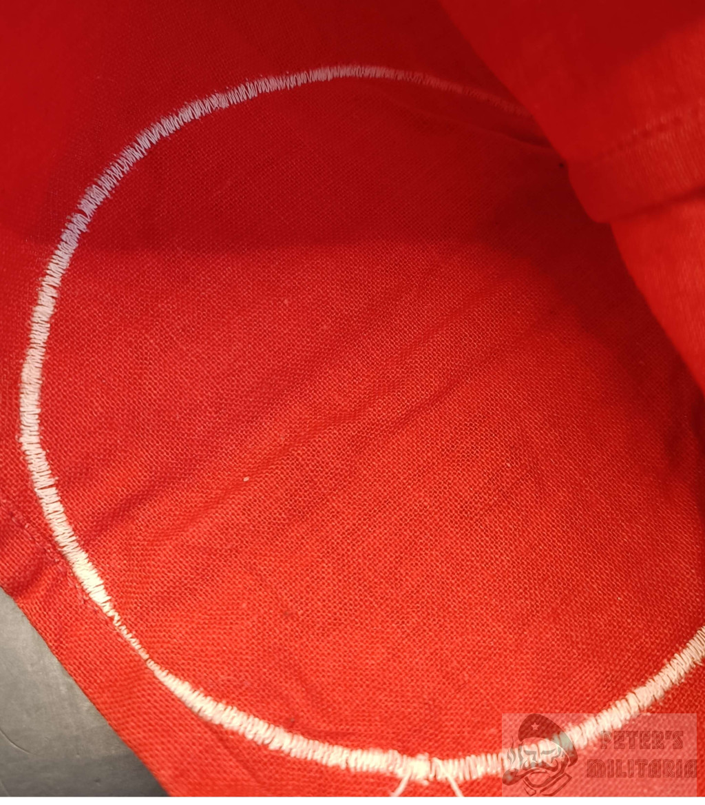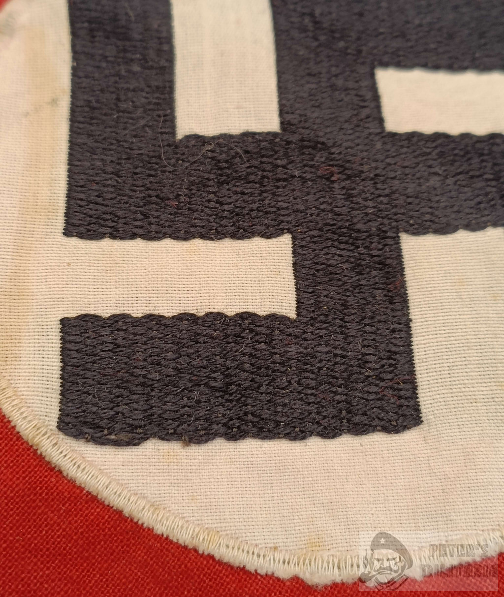 Cloth, with characteristic pattern sewn-on white roundel, with woven black swastika on it.